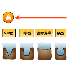 同じ津波でも、湾の形によって、波の高さに違いがあり、上に示した順で波が高くなります。
